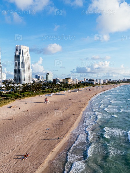 Вид с воздуха мягких волн, прокачивающихся по берегу Майами-Бич с людьми и серферами. c