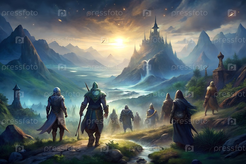 Группа фантастических приключенцев с видом на обширную горную долину и реку при восходе солнца, эпическое путешествие пейзажной сцены. g