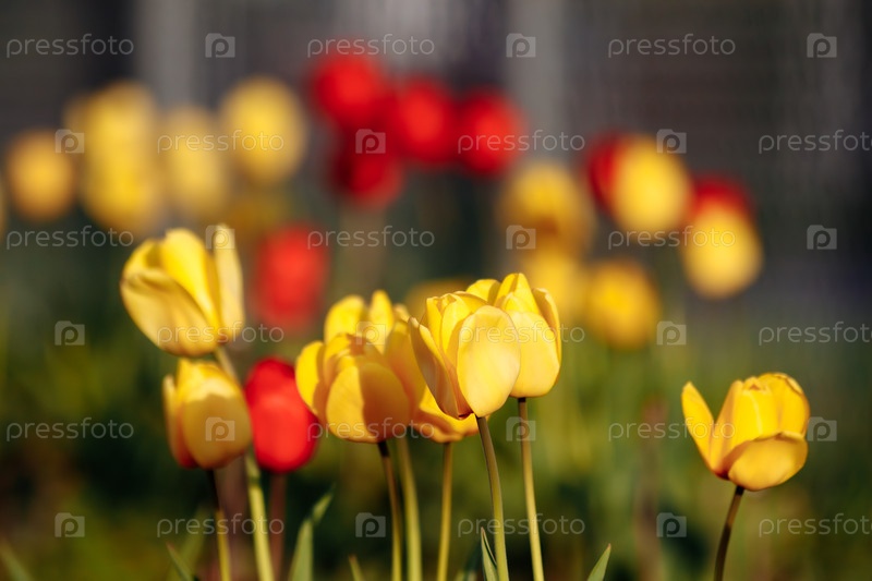 Желтые и красные тюльпаны в цвете под теплым светом весеннего сада