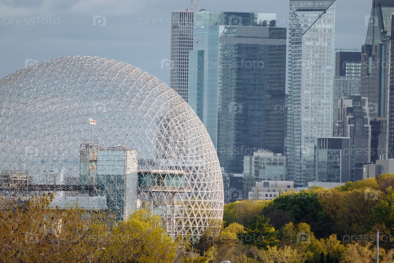 Вид монреальской биосферы с беспилотника в парке Жан-Драпо, на фоне - центр Монреаля.Квебек, Канада