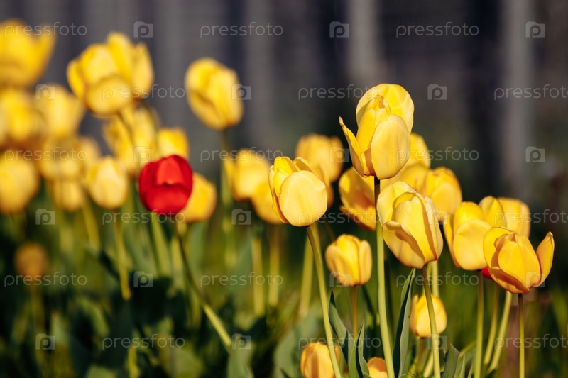 Желтые и красные тюльпаны в цвете под теплым светом весеннего сада