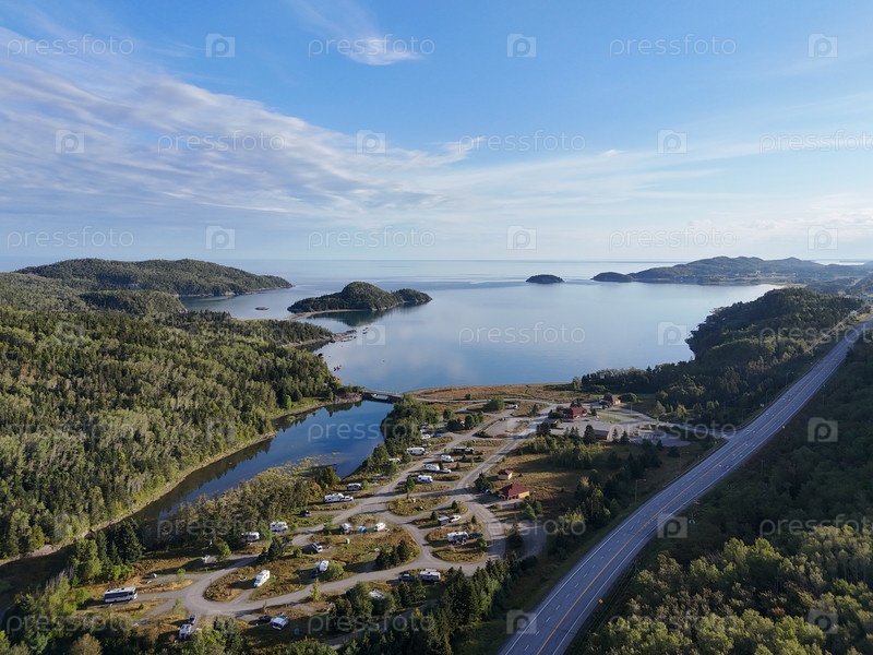 Вид с воздуха на побережье Национального парка Бик, лес, кемпинг и спокойную бухту под голубым небом
