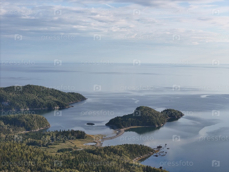Вид с воздуха на побережье Национального парка Бик, лес, кемпинг и спокойную бухту под голубым небом