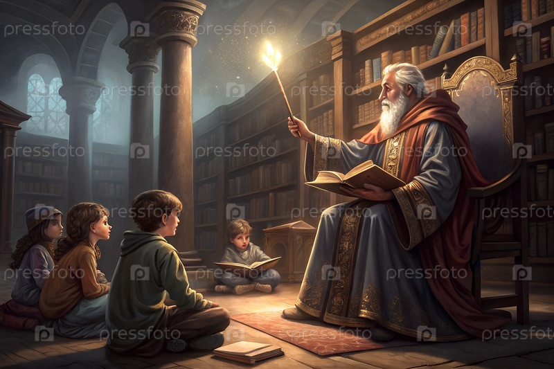 Средневековый маг учит молодых учеников в монастырской библиотеке с помощью волшебного света и древней книги, фэнтезийная сцена обучения