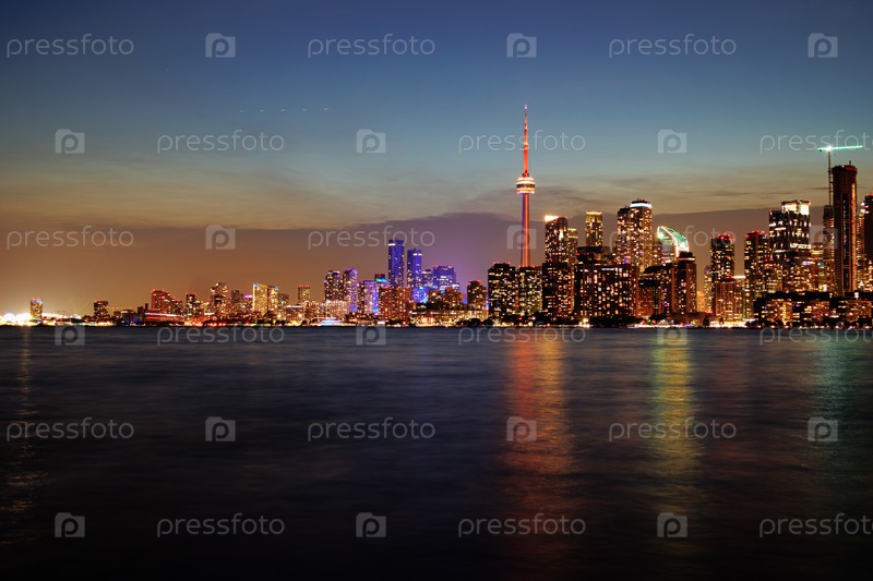 Горизонт Торонто на закате с освещенными городскими огнями, отражающимися в воде, яркий ночной вид города. g