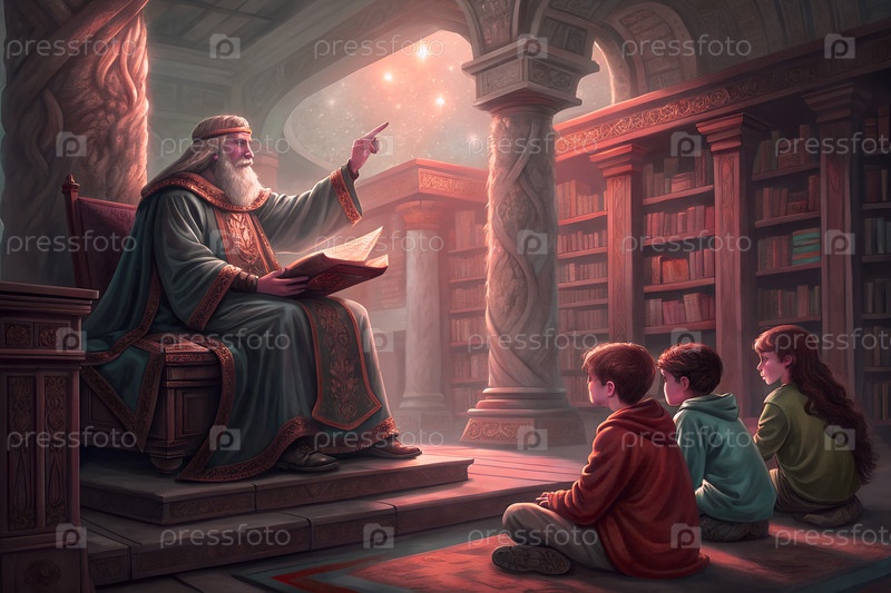 Средневековый маг учит молодых учеников в монастырской библиотеке с помощью волшебного света и древней книги, фэнтезийная сцена обучения