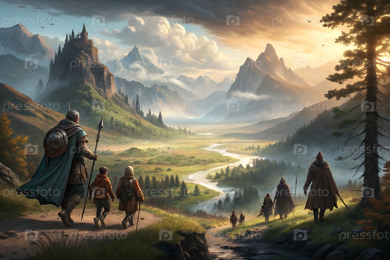 Группа фантастических приключенцев с видом на обширную горную долину и реку при восходе солнца, эпическое путешествие пейзажной сцены. g