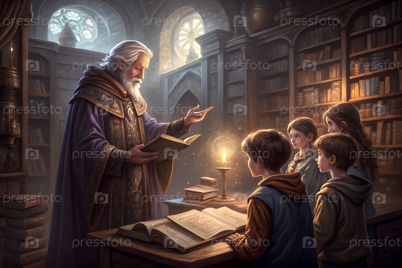 Средневековый маг учит молодых учеников в монастырской библиотеке с помощью волшебного света и древней книги, фэнтезийная сцена обучения