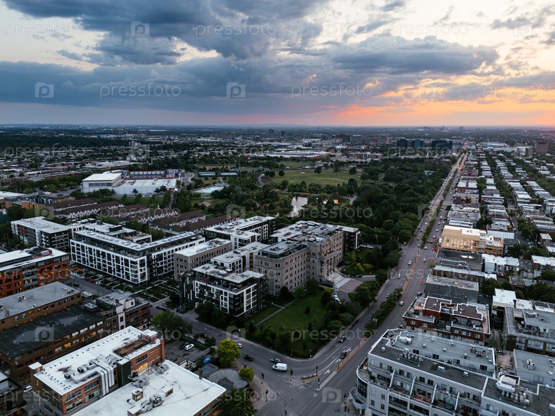 Закат городского пейзажа Монреаля с драматическими облаками и горизонтом городской сетки в Квебеке, Канада. g