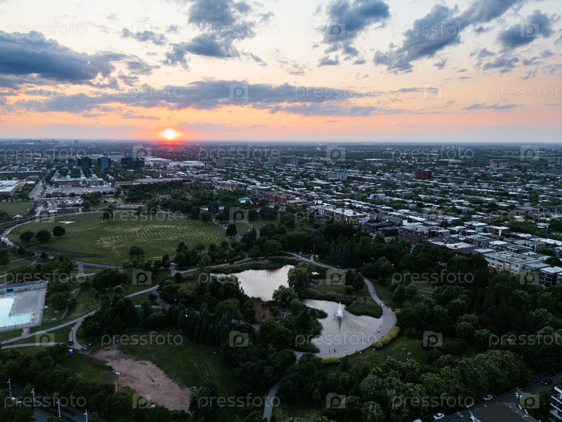 Закат городского пейзажа Монреаля с драматическими облаками и горизонтом городской сетки в Квебеке, Канада. g