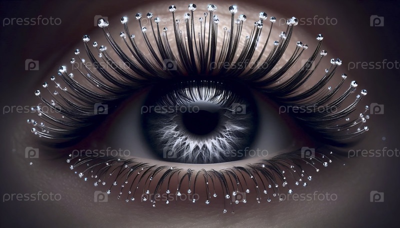 Макропросмотр снизу: отдельные ресницы, увенчанные идеальными серебряными микрокристаллами, Ai generated image