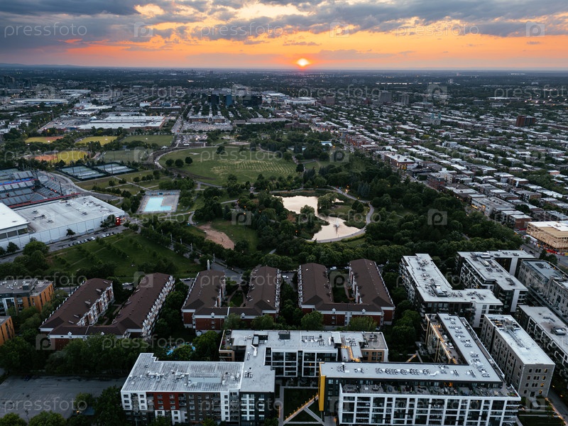 Закат городского пейзажа Монреаля с драматическими облаками и горизонтом городской сетки в Квебеке, Канада. g