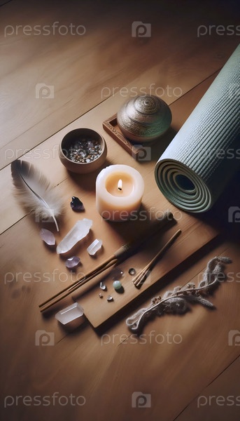 Плоская композиция матраса для йоги с горящими свечами, кристаллами ладана и перьями на натуральном деревянном полу, Ai generated image