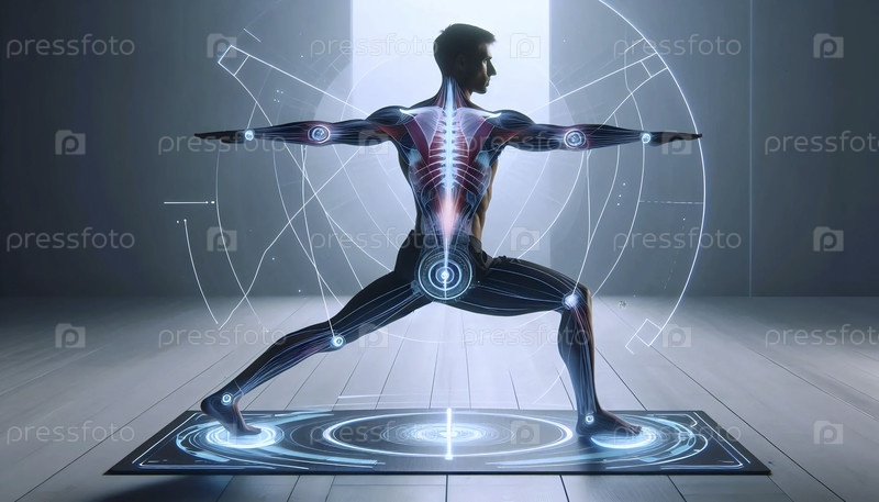 Умный практикующий йогу в позе воина с голографическими проекционными линиями, показывающими выравнивание и взаимодействие мышц, Ai generated image