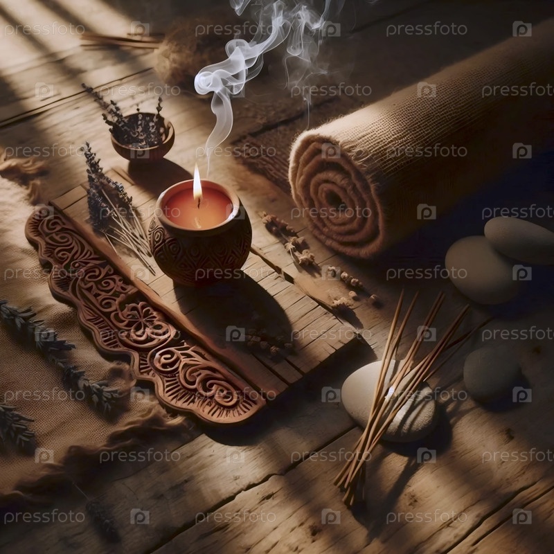 Плоская композиция угловой йоги-матки с терракотной свечой и дымовыми следами в теплом закате на дереве, Ai generated image