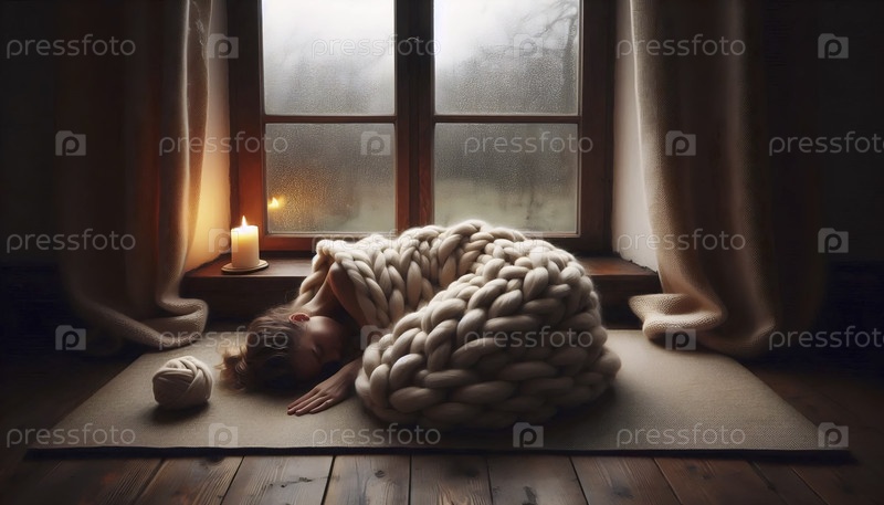 Профессионал в области мелкого оздоровления отдыхает глубоко в детской позе, завернутая в толстое вязанное одеяло у окна с полосами дождя, Ai generated image