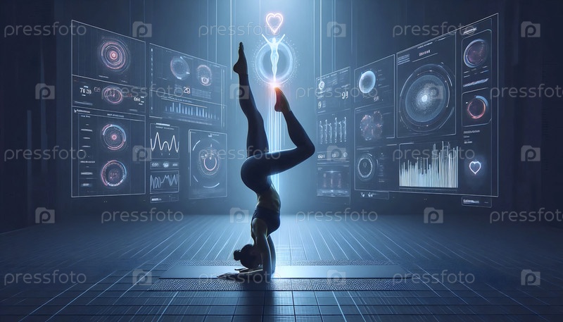 Умный практикующий йогу в головном положении с голографическими показаниями, показывающими баланс сердечного ритма и мышечную активацию, Ai generated image