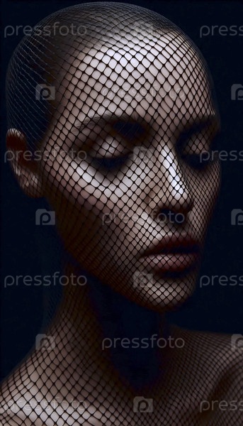 Лицо, покрытое затянутой черной завесой рыболовных сетей, создает геометрические узоры теней, Ai generated image