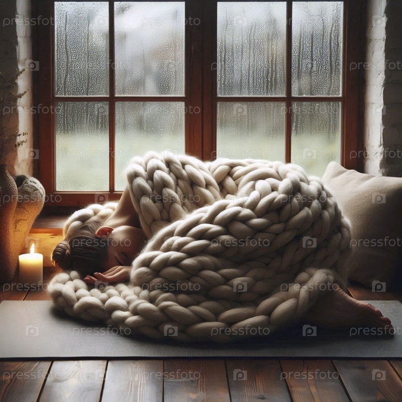 Профессионал в области мелкого оздоровления отдыхает глубоко в детской позе, завернутая в толстое вязанное одеяло у окна с полосами дождя, Ai generated image