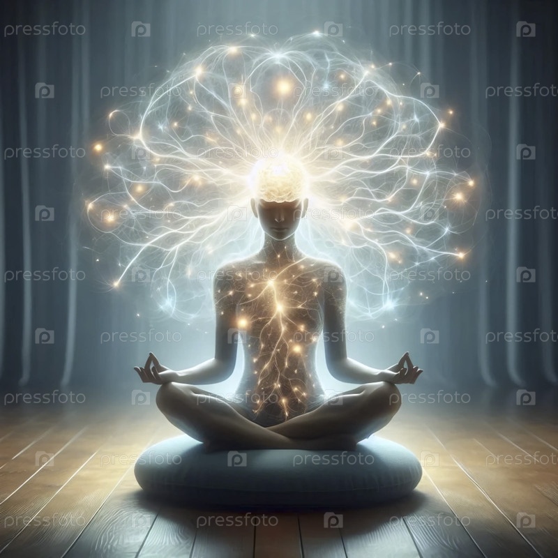 Нейрофитнес-практикующий с сияющими нейронными сетями вокруг головы во время сидячей медитации, Ai generated image