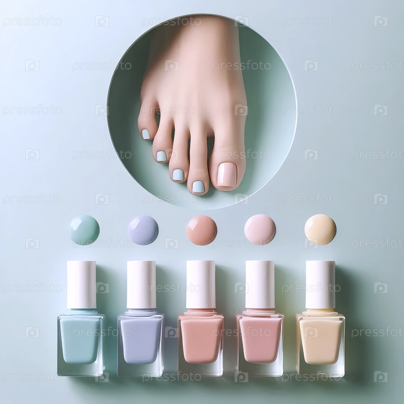 Графический плоский слой из пяти пастельных бутылок лака на ногтях, выравниваемых с вентилятором совпадающих ухоженных пальцев, Ai создал изображение