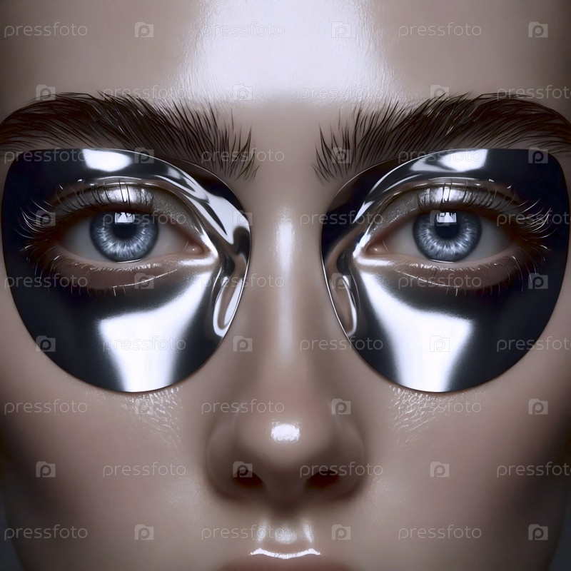 Зеркальная серебряная пленка на веках, отражающая кольцевые круги вспышек, с розовыми ресницами, Ai generated image