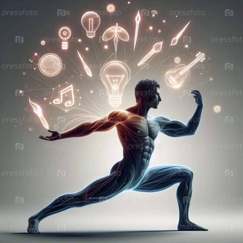 Практикующий йогу в широком воине II позирует с неоновым контуром и плавающими символическими идеями, Ai generated image