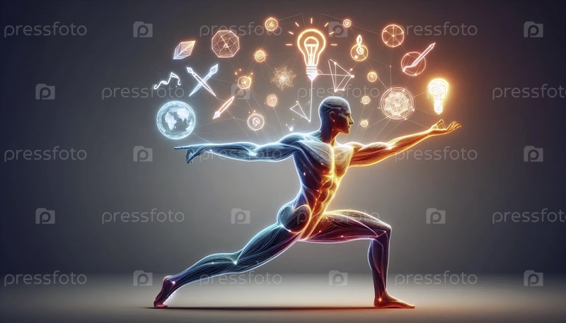 Практикующий йогу в широком воине II позирует с неоновым контуром и плавающими символическими идеями, Ai generated image