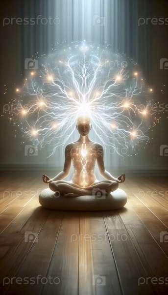 Нейрофитнес-практикующий с сияющими нейронными сетями вокруг головы во время сидячей медитации, Ai generated image