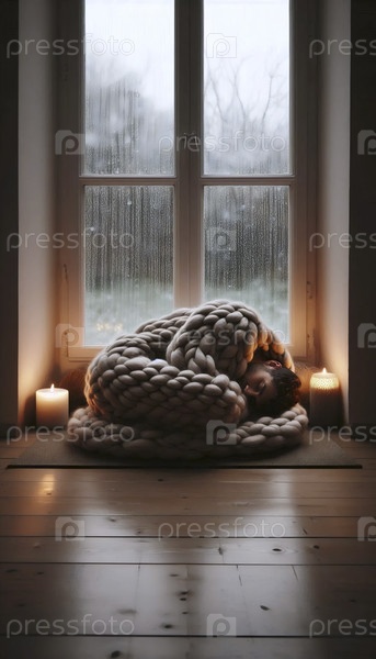 Профессионал в области мелкого оздоровления отдыхает глубоко в детской позе, завернутая в толстое вязанное одеяло у окна с полосами дождя, Ai generated image