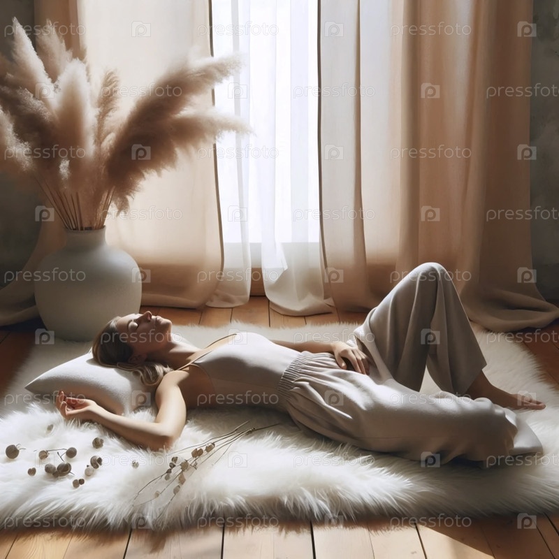 Мягкий практик оздоровления, лежащий в savasana на пушистом ковре из овечьей шкуры с утренним светом и высушенными цветами, Ai generated image