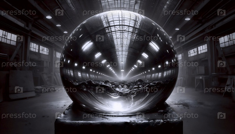 Капля расплавленного стекла на стальной наконечнике, ее поверхность отражает грязный потолок мастерской в искаженной серой панораме
