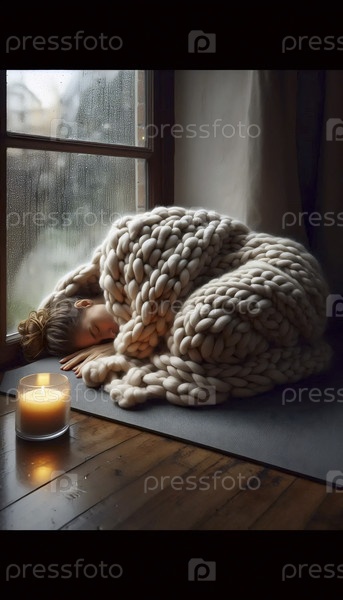 Профессионал в области мелкого оздоровления отдыхает глубоко в детской позе, завернутая в толстое вязанное одеяло у окна с полосами дождя, Ai generated image