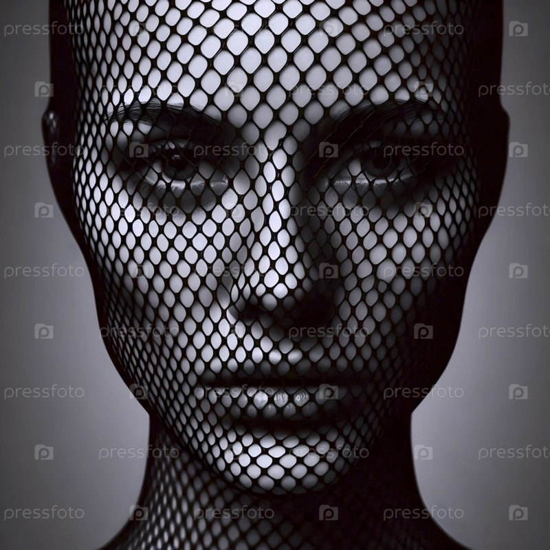 Лицо, покрытое затянутой черной завесой рыболовных сетей, создает геометрические узоры теней, Ai generated image
