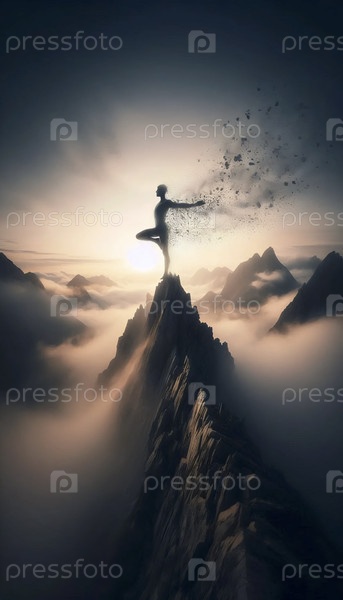 Практикующий йогу в позе воина на горном хребте с краями тела, растворяющимися в туманном пейзаже, становясь одним из элементов, Ai generated image