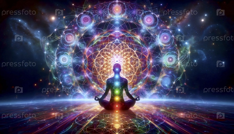 Практикующий йогу в лотосе позирует в центре светящейся космической мандалы с волнами энергии чакры, сливающейся со священной геометрией, Ai generated image
