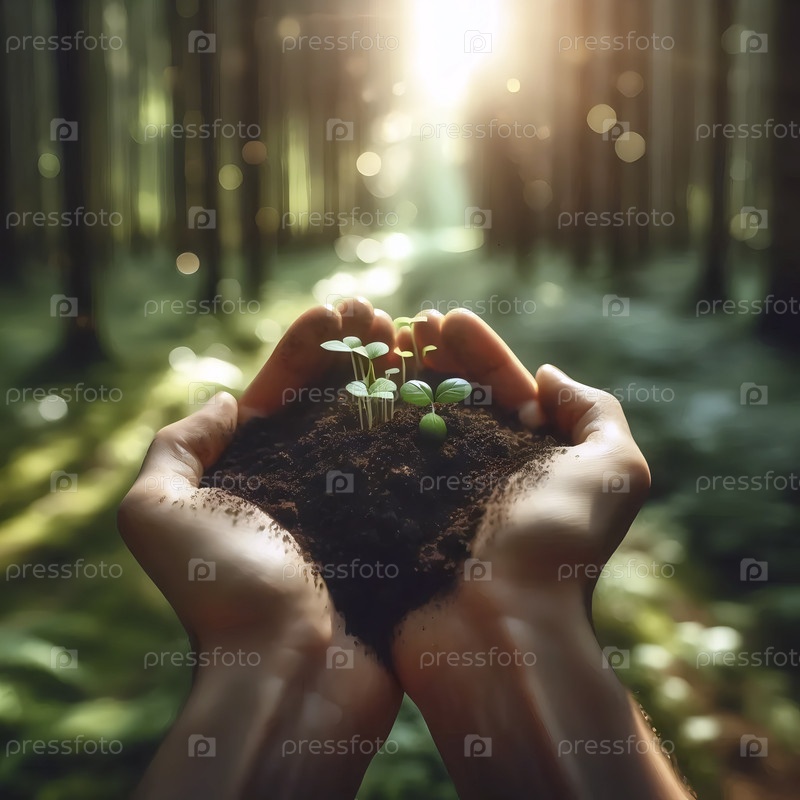 Близкий снимок рук практикующих эко-йогу, купающихся в богатой темной почве с растущими зелеными листьями в лесу, Ai generated image
