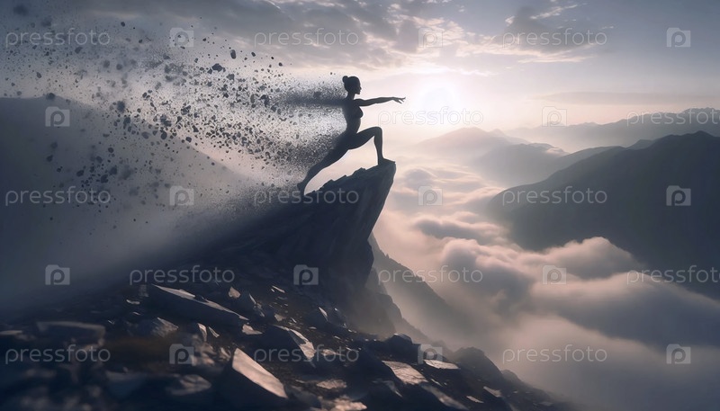 Практикующий йогу в позе воина на горном хребте с краями тела, растворяющимися в туманном пейзаже, становясь одним из элементов, Ai generated image