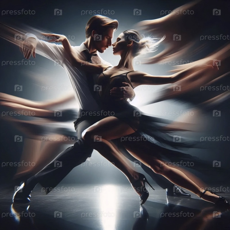 Пара танцует танго, движение размытое, но их интенсивные лица резко освещены и сфокусированы