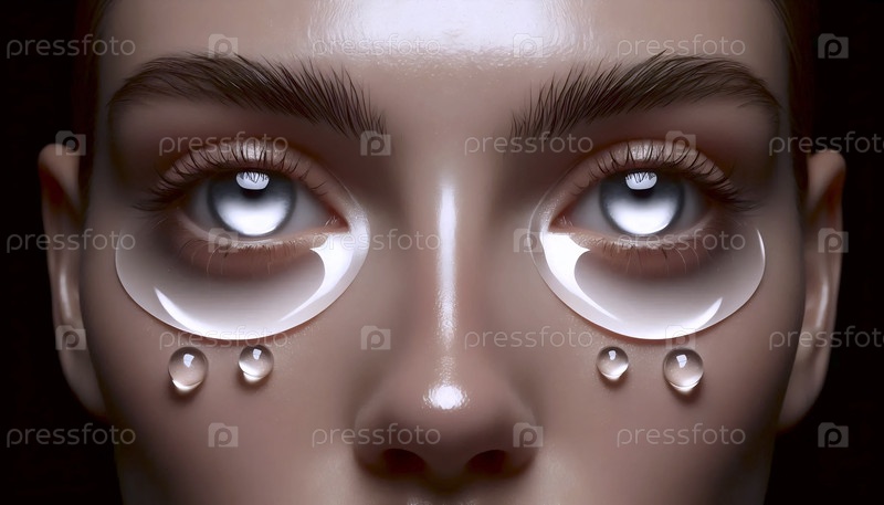 Зеркальная серебряная пленка на веках, отражающая кольцевые круги вспышек, с розовыми ресницами, Ai generated image