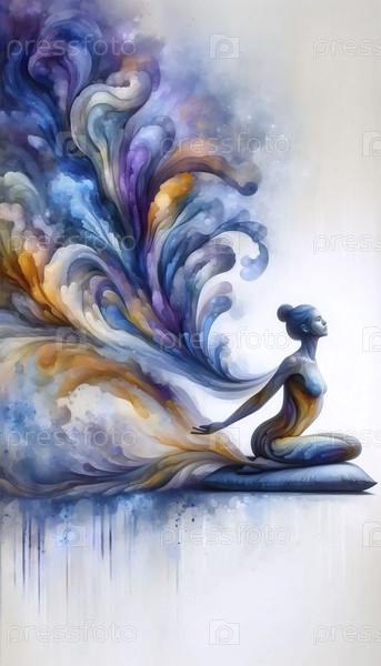 Практикующий йогу в сидячем виде растворяется в текущей абстрактной акварели творческая энергия, Ai generated image