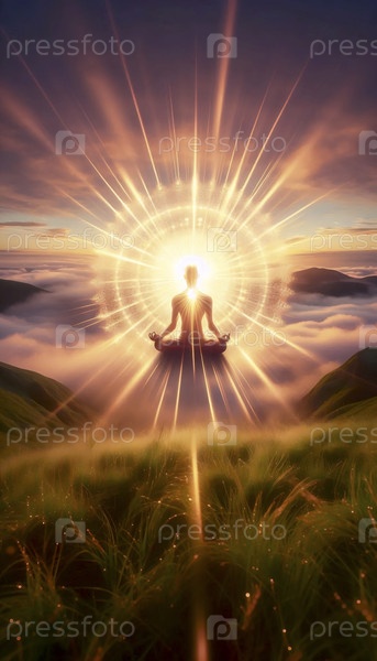 Практикующий йогу в лотосной позе с сияющим светом, исходящим из сердца и сливающимся со золотым восходом солнца в туманном пейзаже, Ai generated image