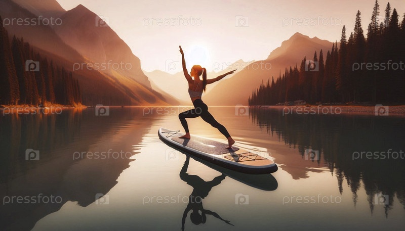 Практикующий йогу SUP в Warrior III позирует на борту над спокойным горным озером в золотое время, Ai generated image