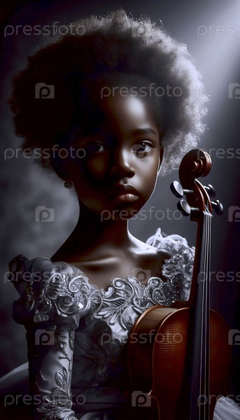 Чудо-ребенок, серьезная молодая девушка в праздничном платье, держащая скрипку, освещенная как дива, Ai generated image