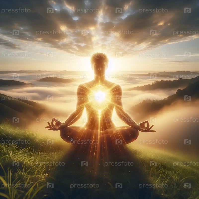 Практикующий йогу в лотосной позе с сияющим светом, исходящим из сердца и сливающимся со золотым восходом солнца в туманном пейзаже, Ai generated image