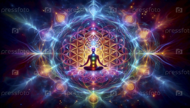 Практикующий йогу в лотосе позирует в центре светящейся космической мандалы с волнами энергии чакры, сливающейся со священной геометрией, Ai generated image