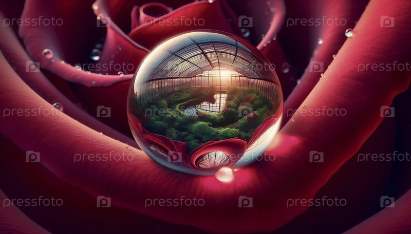 Капля дождя на листье пурпурной розы, отражающая всю теплицу в миниатюрном мире, Ай создала изображение