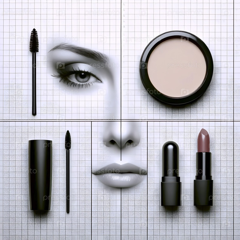 Плоская полоса головоломки лица: косметические изделия рядом с круглыми вырезками их применения, Ai generated image