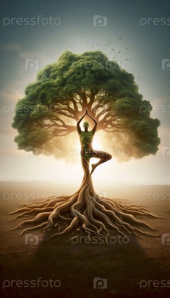 Практикующий йогу в позе дерева превращается в могущественный дуб с корнями, текущими из ног и ветвями от рук, Ai generated image