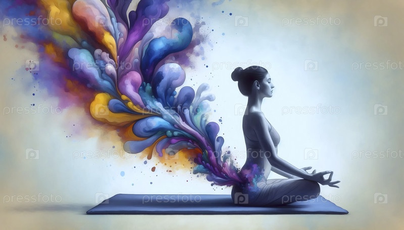 Практикующий йогу в сидячем виде растворяется в текущей абстрактной акварели творческая энергия, Ai generated image